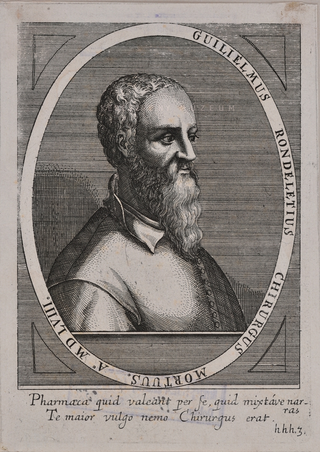 Körirat: GUILIELMUS RONDELETIUS CHIRURGUS MORTUUS A. MDLVIII. Lent: Pharmaca quid valeant per se, quid mixtave narras / Te maior vulgo nemo Chirurgus erat. Hhh3