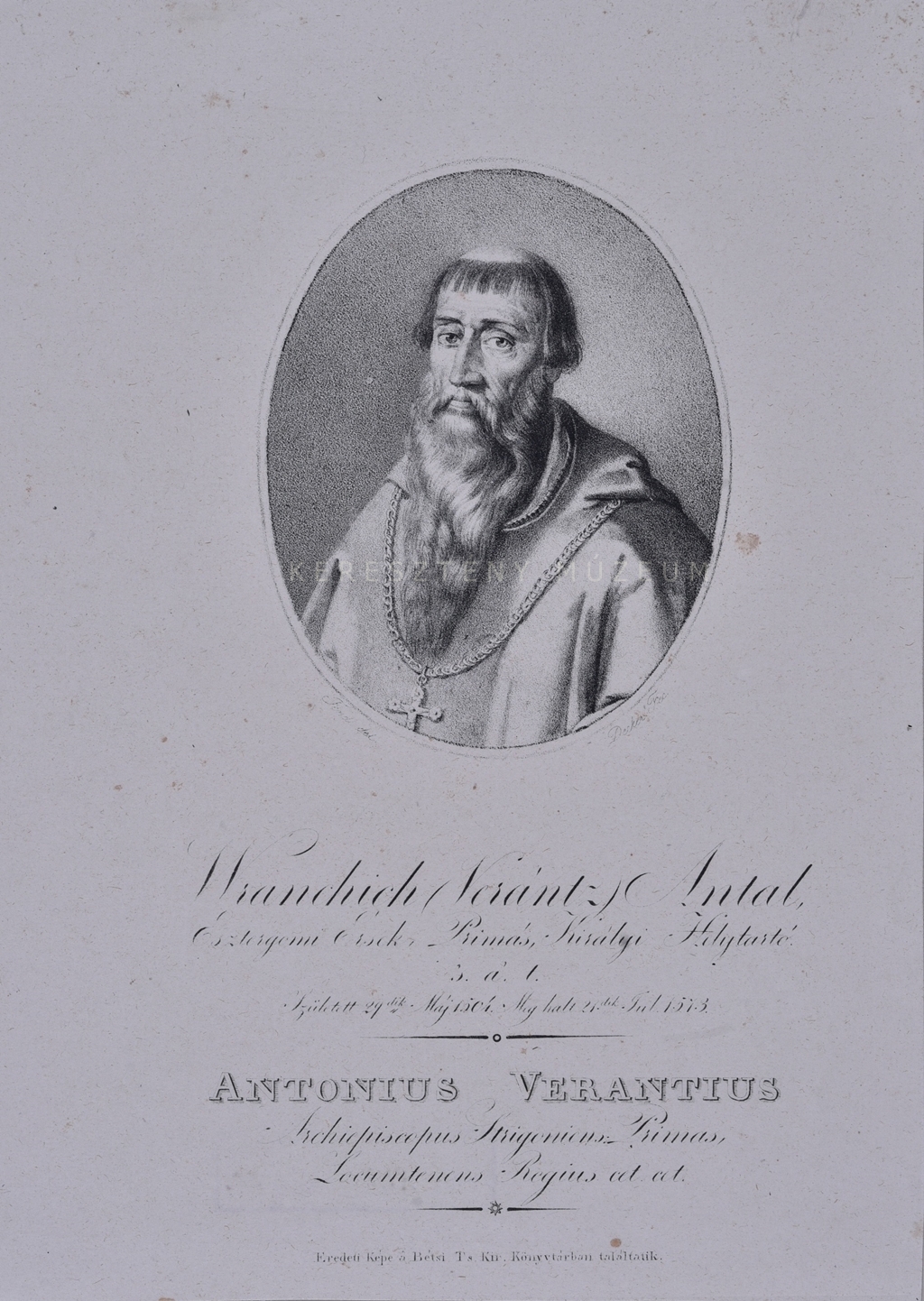 Wranchich (Verántz) Antal / Esztergomi Érsek, primás, Királyi Helytartó s. a. t. / Született 29. Máj. 1504. Meg halt 21ik Jul 1573. / Antonius Verantius / Archiepiscopus Strigoniens. Primas / Locumtenens Regius ect. Ect. / Eredeti képe a' Bétsi Ts. Kir. Könyvtárban találtatik.