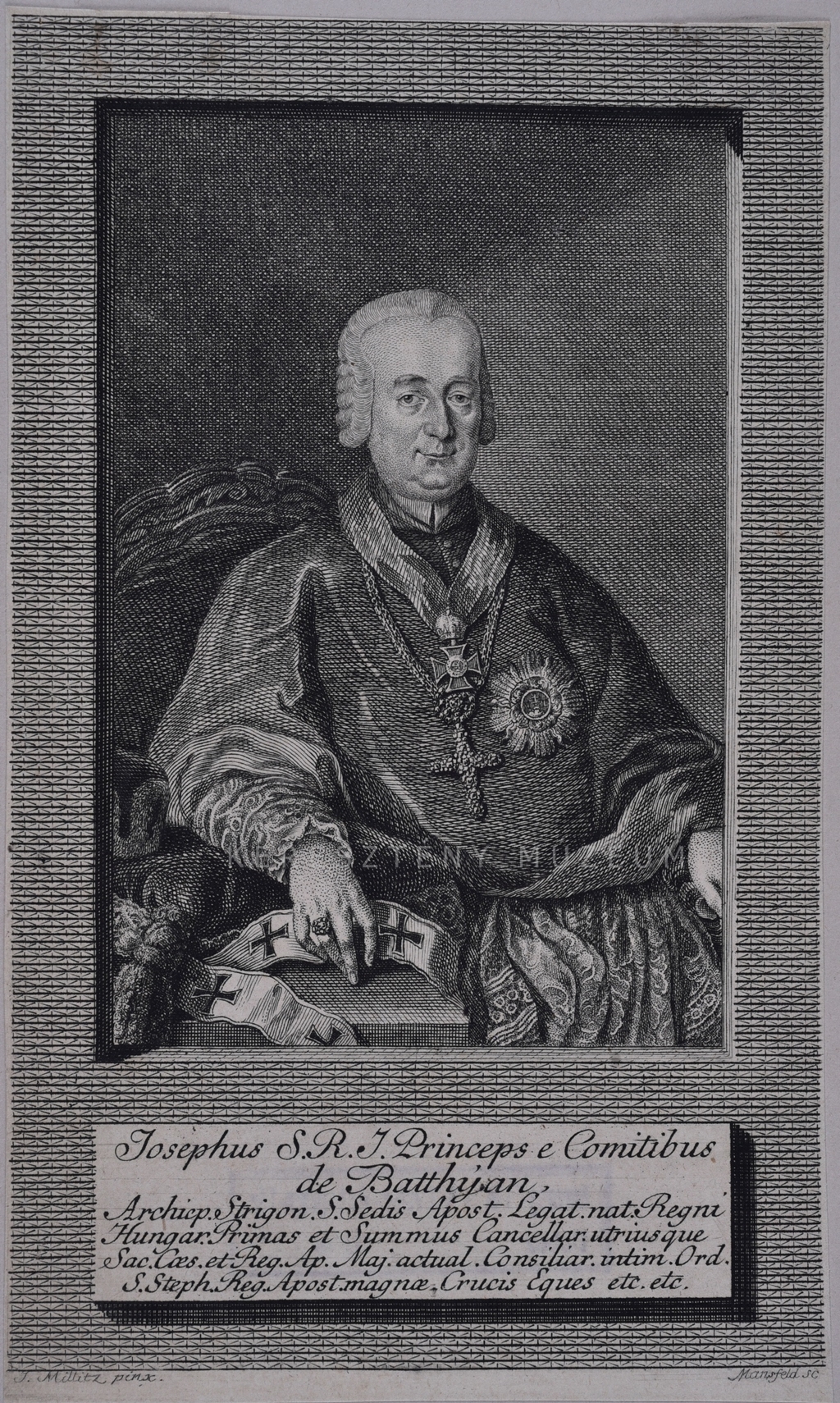 Josephus S. R. I. Princeps e Comitibus de / Batthyany / Archiep. Strigon. S. sedis Apost. Legat. Nat. Regni / Hungar. Primas et Summus Cancellar utriusque / Sac. Caes. et Reg. Ap. Maj. Actual. Consiliar. Intim. Ord. / S. Steph. Reg. Apost. Magnae Crucis eques etc. etc.