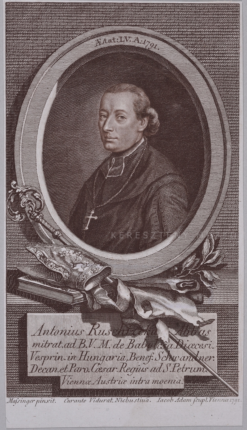 Antonius Ruschitzka Abbas / mitrat. ad B. M. V. de Babolcsa Dioecesi. / Vesprin. In Hungaria Benef. Schwandner. / Decan. et Paro. Caesar Regius ad S. Petrum. / Viennae Austriae intra moenia.