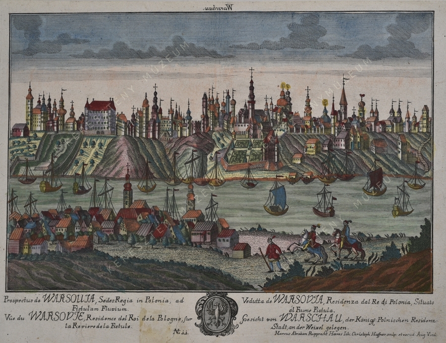 Cím (tükörképesen): Warschau. A kép alatt: Prospectus de WARSOUIA, Sedes Regia in Polonia, ad / Fistulam Fluvium. // Vüe de WARSOVIE, Residence del Roi dela Pologne, sur / la Reviere de la Fistule. // Vedutta de WARSOVIA, Residenza dal Re di Polonia, Situato / al Fiume Fistula. // Gesicht von WARSCHAU, der Königl. Polnischen Residenz-/ Stadt, an der Weixel gelegen. | No. 11.