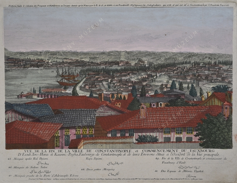 Cím: VUE DE LA FIN DE CONSTANTINOPLE, et COMMENCEMENT DU FAUXBOURG / D'Eioub, Ters-Hana et Kassim-Pagha, Faubourgs de Constantinople et de leurs Environs Situés à l'Occident de la Vue Principale. | Huittieme feuille de Collection des Prospects et Habillemens en Turquie, desinés après Nature par le B. de G. et dediés, a ses Excellences Messeigneurs les Ambassadeurs, qui sont, et qui ont eté à Constantinople par l'Academie Imperiale. | A cím alatt jelkulcs 45-50. számig, latin és arab betűs magyarázatokkal..
